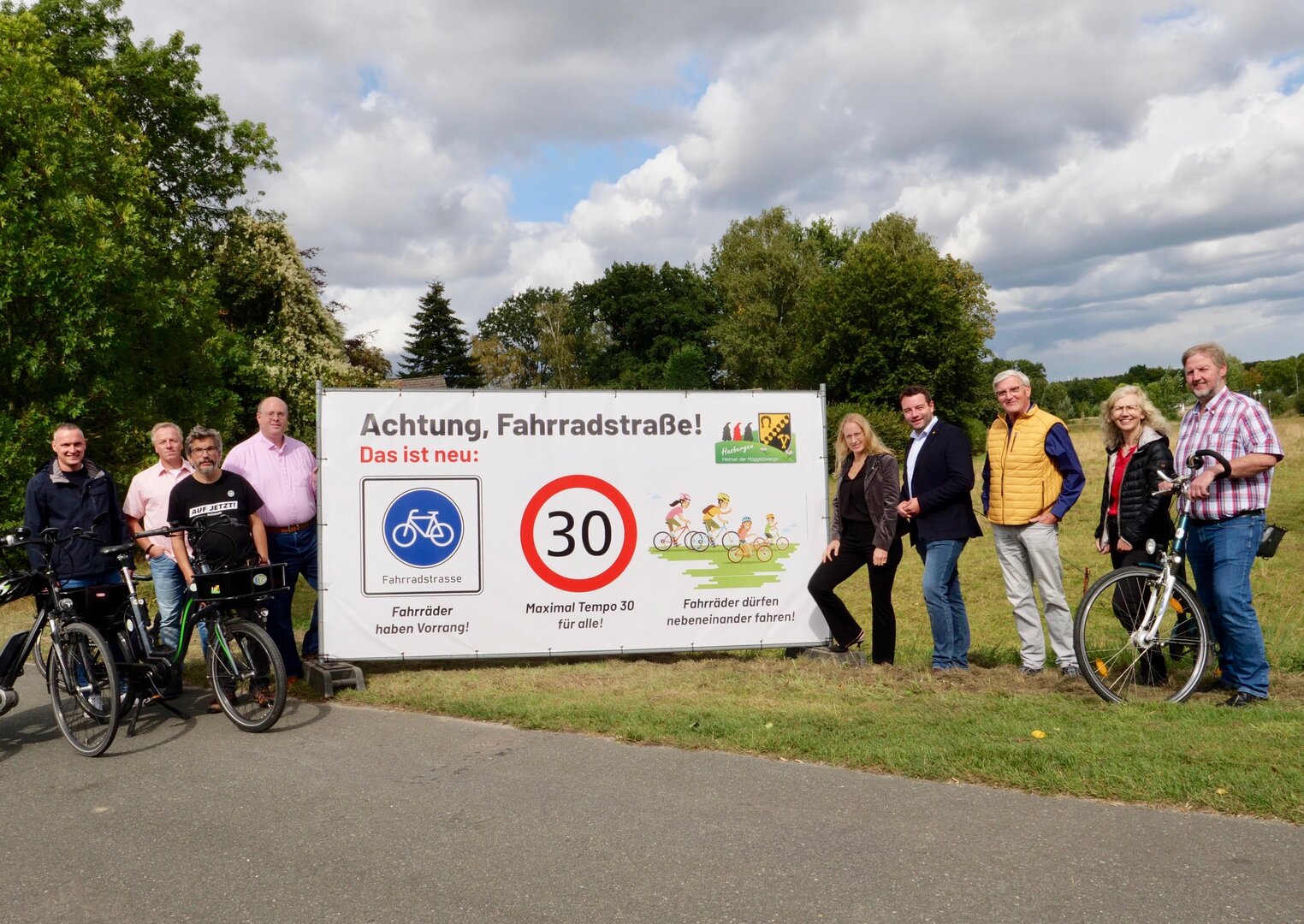 Zu zweit oder dritt auf dem Fahrrad nebeneinander fahren und sich dabei unterhalten, ohne dass Autofahrer hupen oder wild gestikulierend überholen? Ab sofort werden Radfahrern diese besonderen Rechte auf dem 280 Meter langen Abschnitt der Alten Tecklenburger Strasse eingeräumt. Bürgermeister Adrian Schäfer weihte gemeinsam mit Landrätin Anna Kebschull sowie Vertretern aus Politik und Verwaltung am Donnerstag die erste Fahrradstraße der Gemeinde ein. Hasbergen folgt damit klimafreundlichen Verkehrswende-Beispielen aus Großstädten.