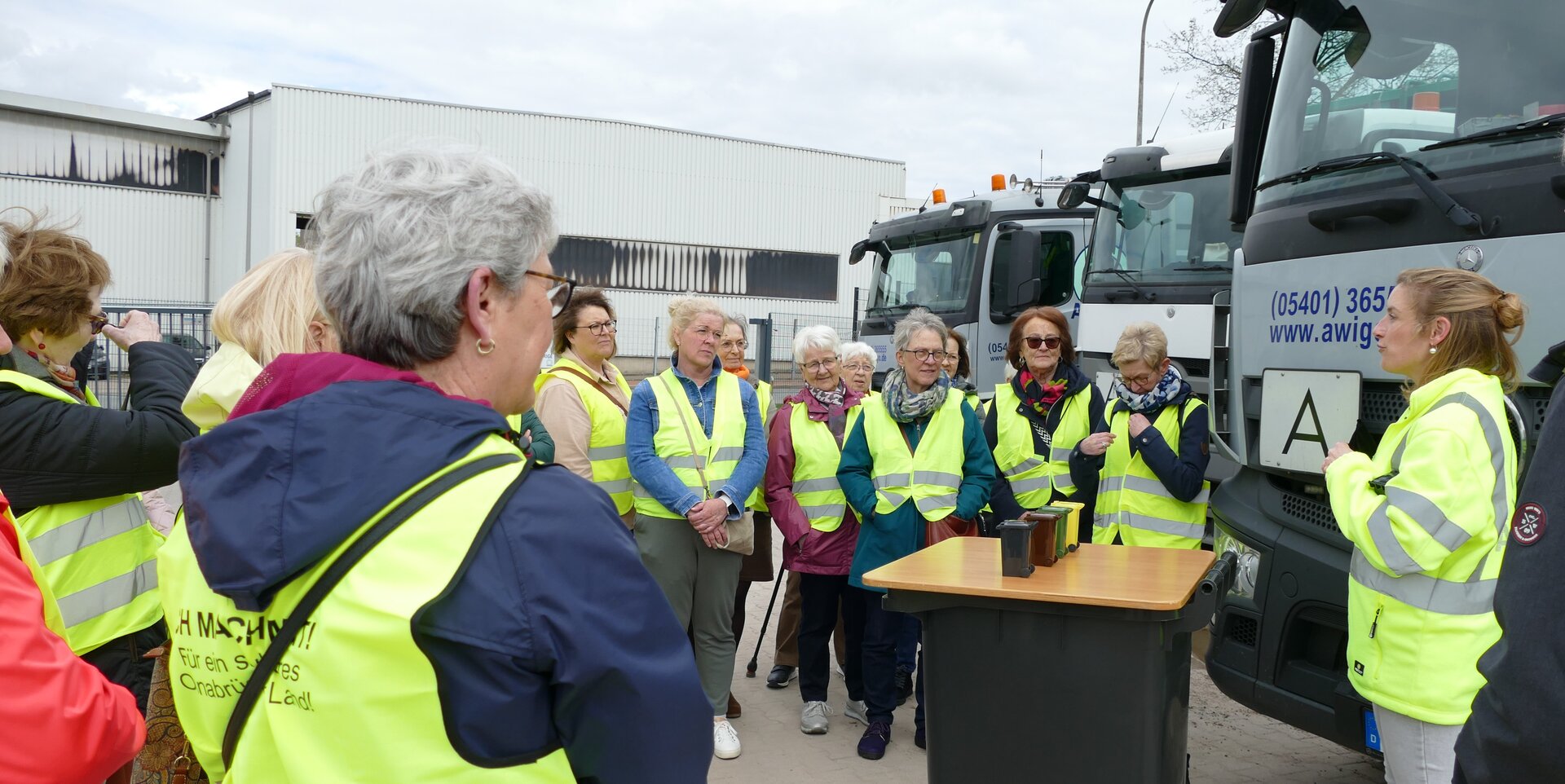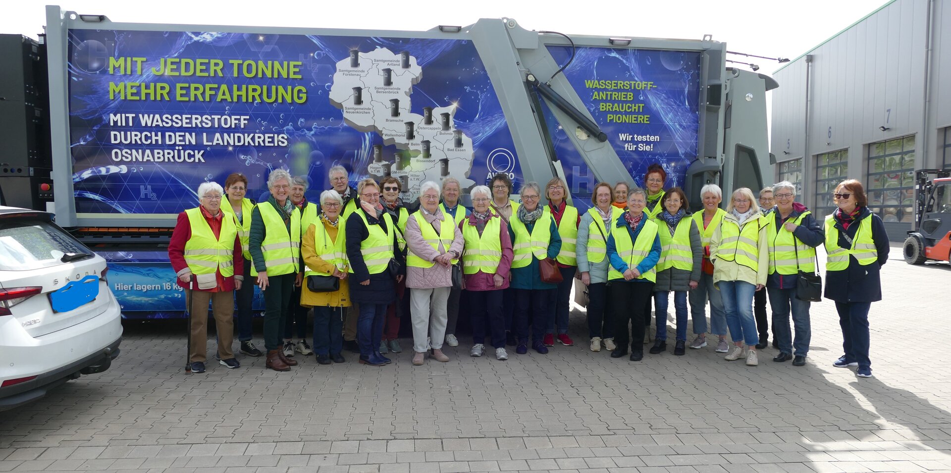 Jetzt ging es weiter zum Fuhrpark wo es Seitenlader oder Hecklader gibt. Hecklader werden bei der gelben Tonne und bei Papiermüll eingesetzt .Dort fährt auch immer eine zweite Person mit,da bei diesem Müll immer noch was neben der Tonne stehen könnte.Mit dem Seitenlader werden die anderen Müllarten abgeholt. Der Müll der grauen Tonnen wird erst nach Wallenhorst gebracht und von dort aus weiter bis zur holländischen Grenze zu dortige Müllverbrennungsanlage .Dann gibt es natürlich auch noch LKWs für den Sperrmüll. Diese werden in der nächsten Zeit auf Hybridfahrzeuge umgestellt.Vorteile hierbei: die Presse wird elektrisch bedient ,dieses geht viel leiser und der LKW kann während des pressen ausgestellt werden. Um auch beim Kraftstoff nachhaltiger zu werden, werden drei LkWs mit Pflanzenöl dem HVO 100 betrieben. Dieses passiert in Kooperation mit Q1. Ein weiterer Lkw wird mit Wasserstoff betrieben. 800 Mülltonnen müssen pro Tag pro LKW geleert werden.Die Awigo beschäftigt an allen Standorten insgesamt 400 Mitarbeiter. Zum Ende der der Besichtigung gab es für jede Frau noch ein kleines Geschenk. Es war ein sehr eindrucksvoller und informativer Nachmittag bei der Awigo. Im Anschluss an die Besichtigung fuhr man zum Restaurant Waldesruh. Dort lies man bei Kaffee und köstlichen Kuchen diesen gelungenen Nachmittag ausklingen.