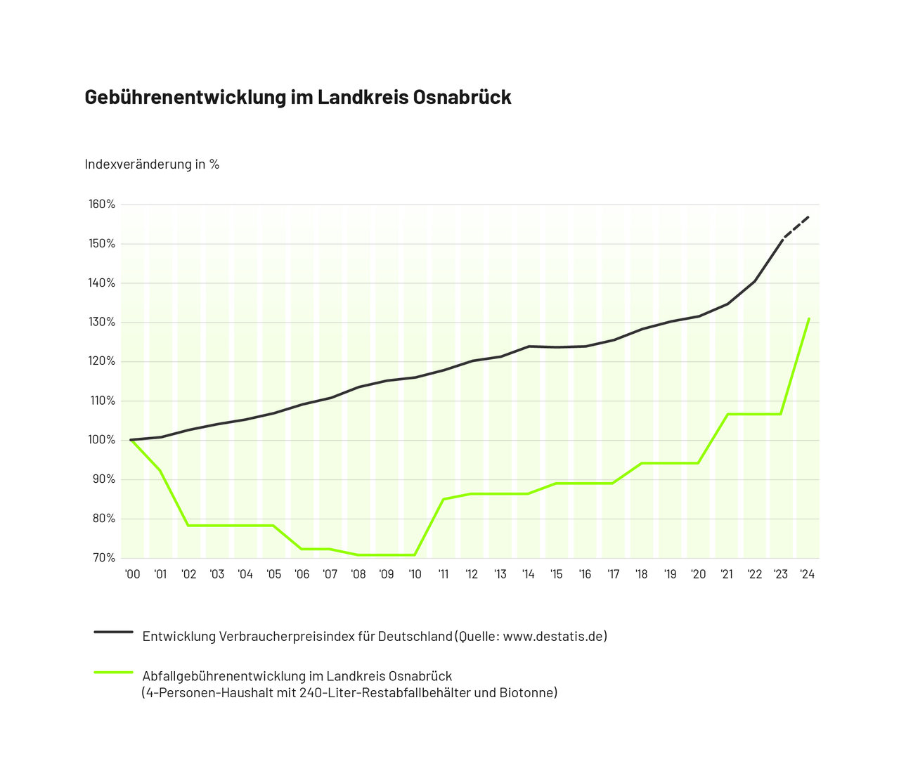 Die Grafik zeigt die Entwicklung der Abfallgebühren im Landkreis Osnabrück im Vergleich zur allgemeinen PreisentwicklungDie Grafik zeigt die Entwicklung der Abfallgebühren im Landkreis Osnabrück im Vergleich zur allgemeinen PreisentwicklungAWIGO