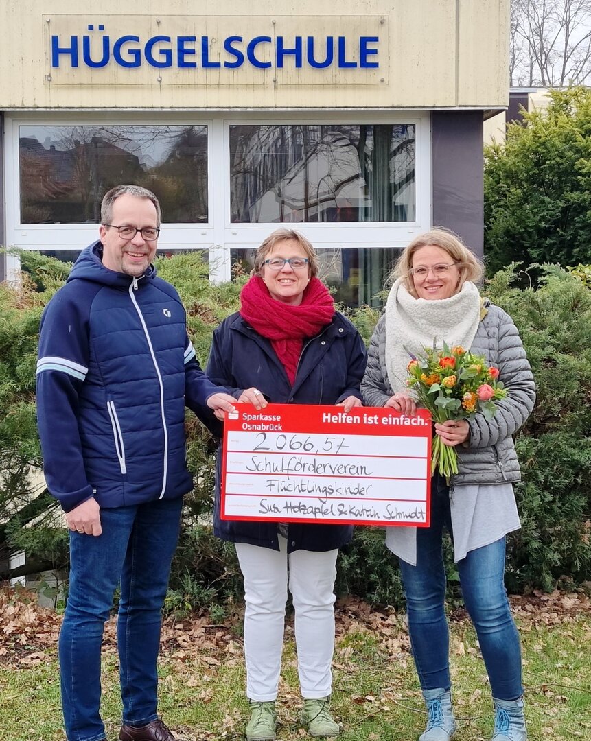 Katrin Schmidt, Kinder- und Jugendreferentin der Gemeinde Hasbergen und Susanne Holzapfel, die Initiatorinnen der Spendenaktion, konnten Andreas Günther, dem Vorsitzenden des Schulfördervereins einen Scheck überreichen. Das Geld kommt den nach Hasbergen geflüchteten Kindern und Jugendlichen zugute.